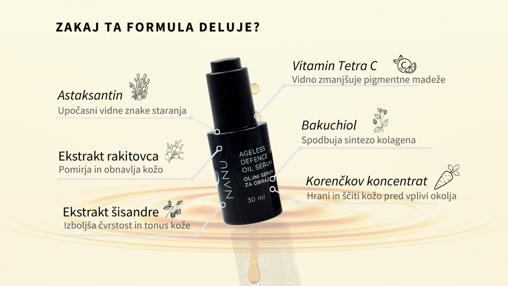 Oljni serum je hitro vpojen in zaradi svoje edinstvene formulacije ustreza vsem tipom kože